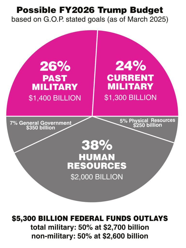 Back to Tax Day. As the website Politico reports, Trump and his Secretary of Defense Hegseth will propose a trillion-dollar budget for the Pentagon for the fiscal year beginning in October 2025, an increase from the $892 billion budget for the fiscal year we are in now. For a useful overview of what this new military budget means, I recommend a program from Democracy Now! last week featuring Bill Hartung, “Elon Musk Stands to Get Even Richer as Trump Backs $1 Trillion Budget for Pentagon.”